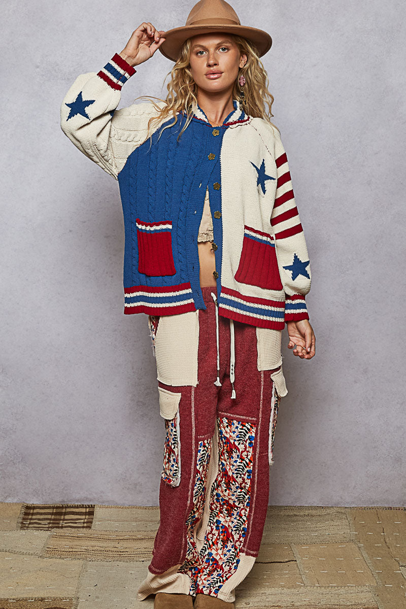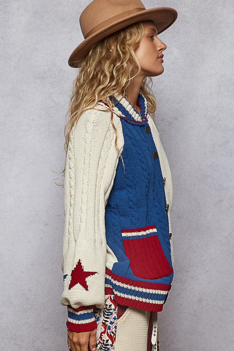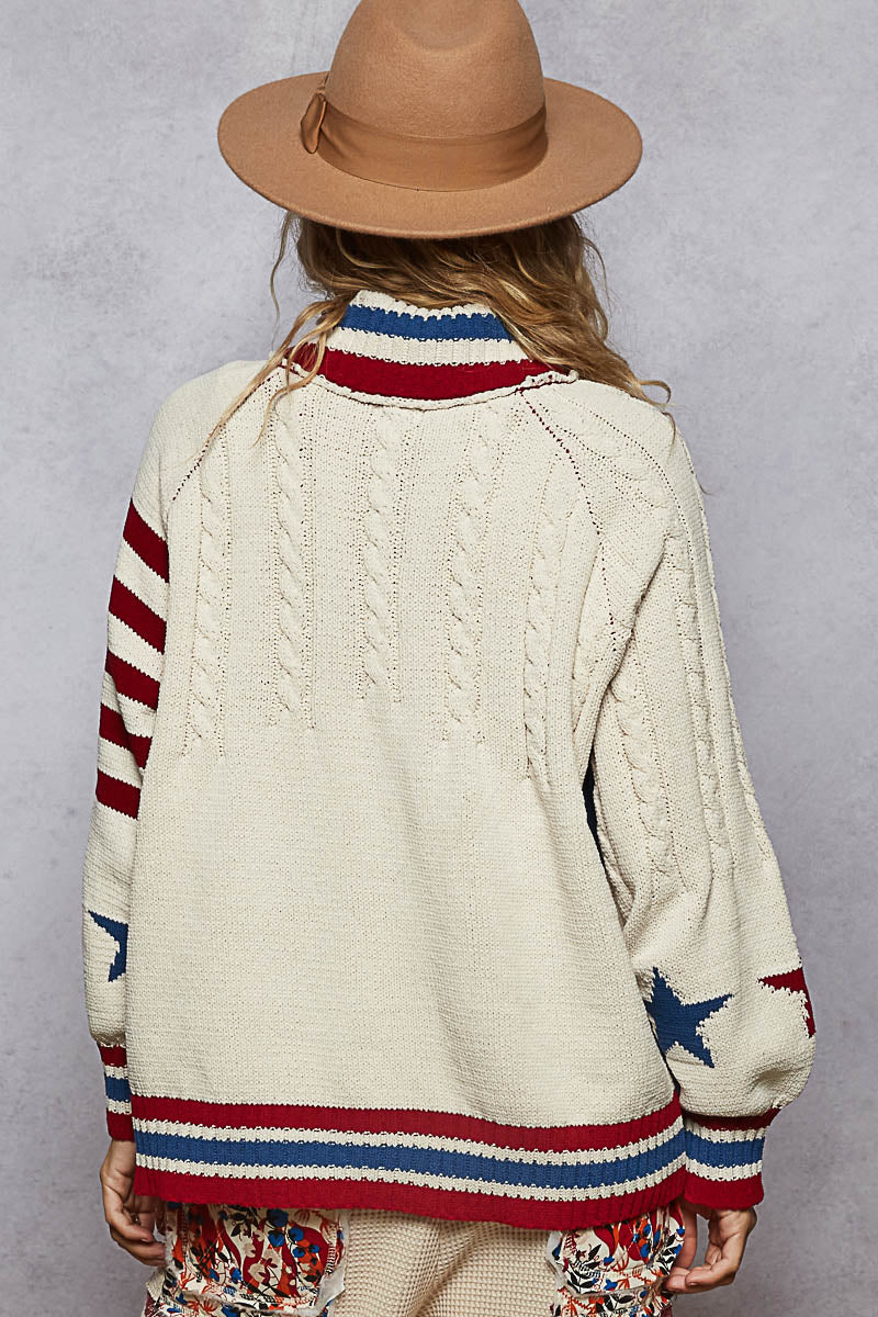 POL Collar Neck Striped Star Chenille Sweater Cardigan Top