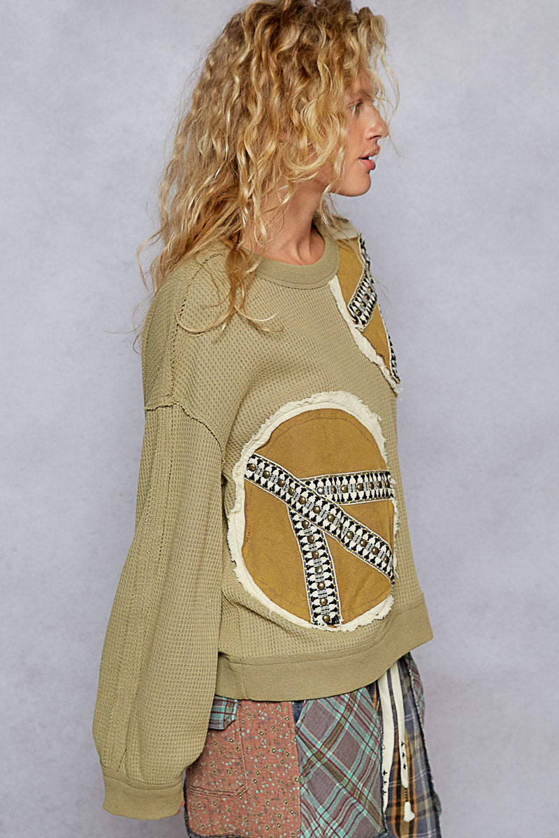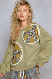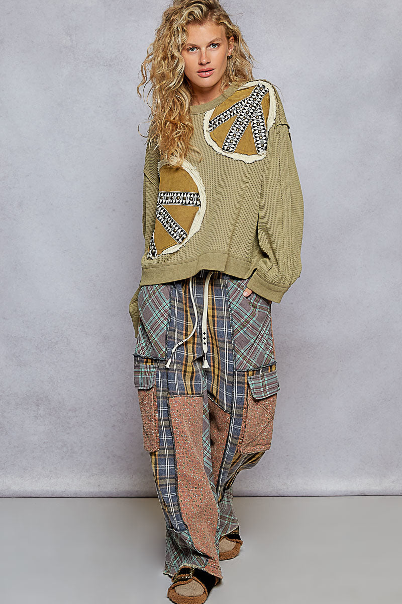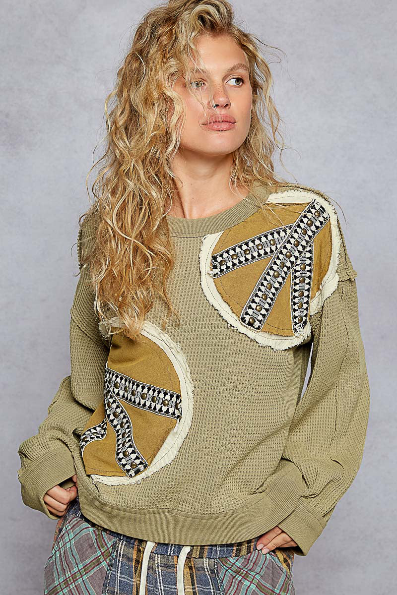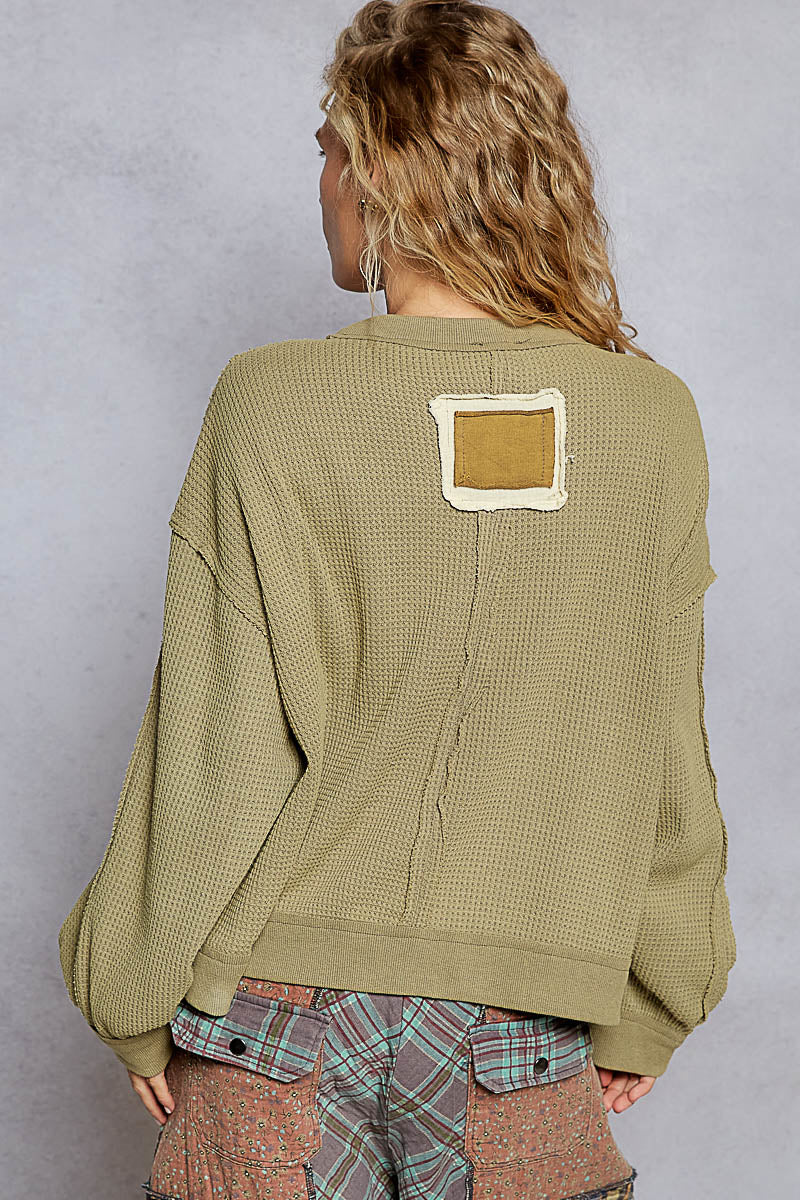POL Waffle Knit Embroidered Patch Work Pullover Olive