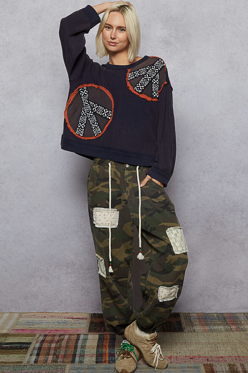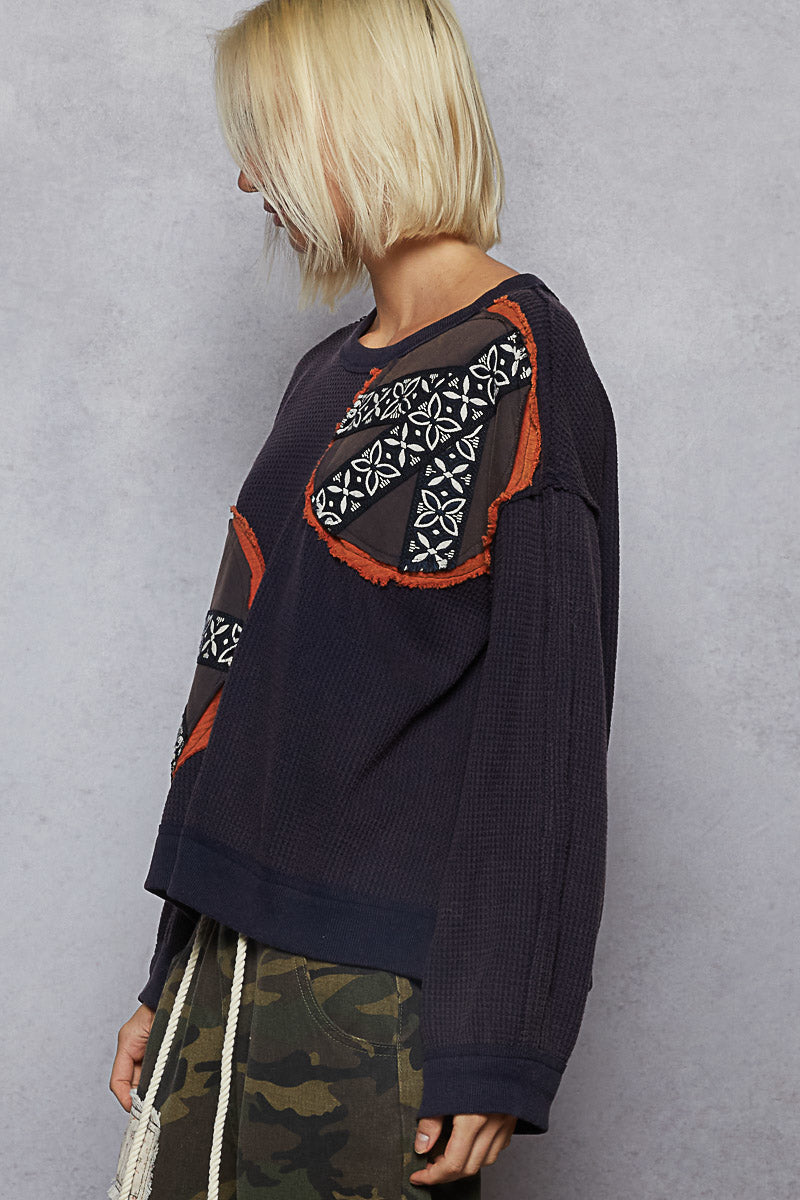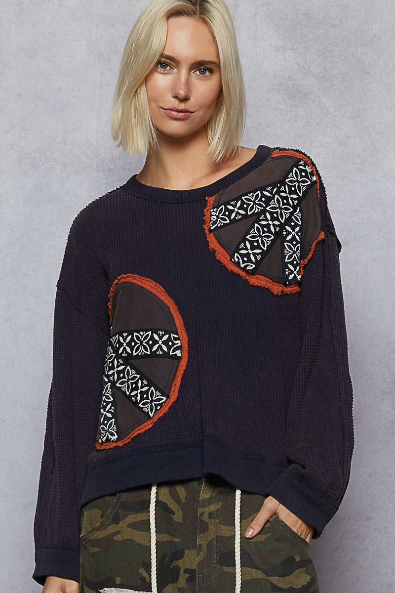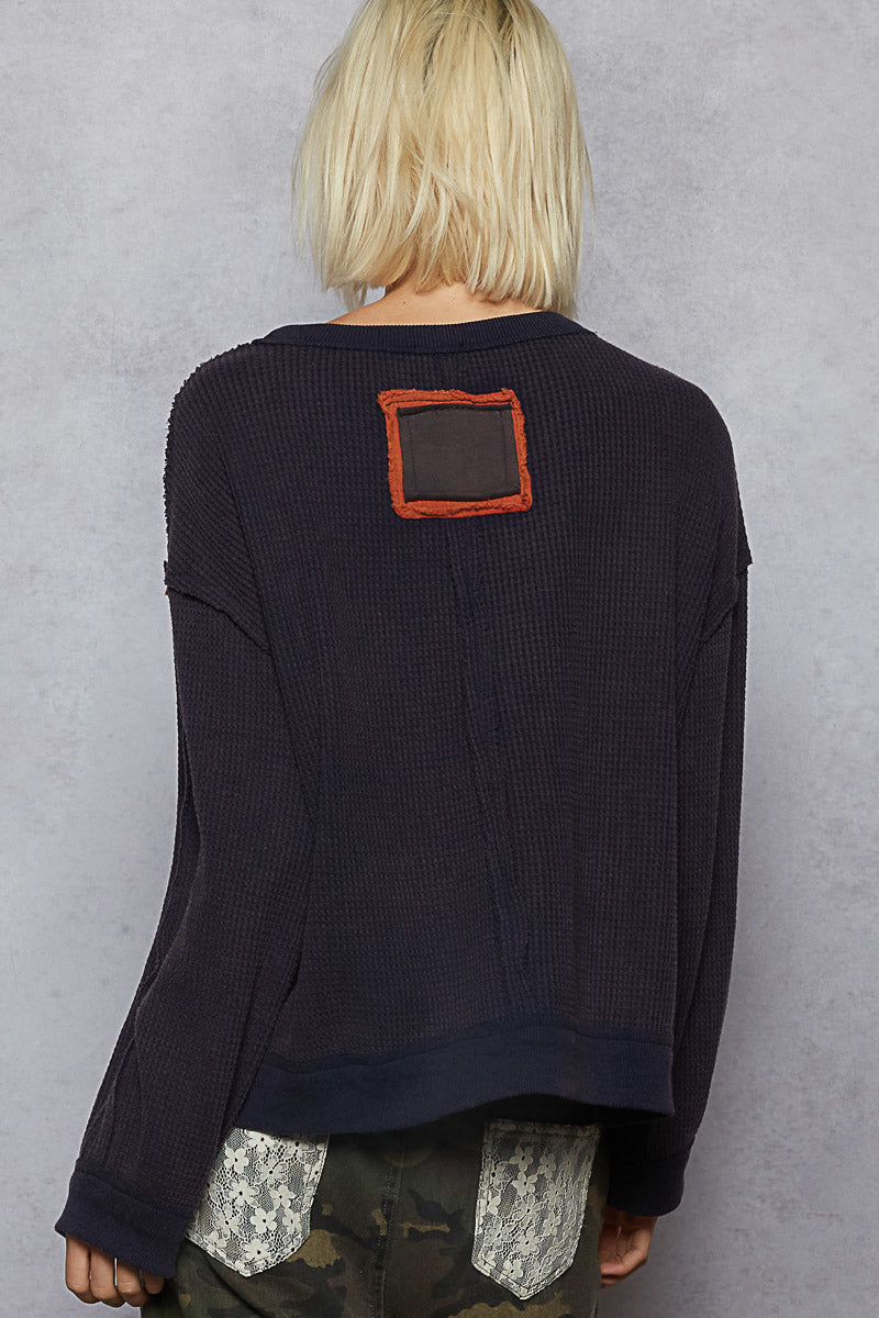 POL Waffle Knit Patch Work Pullover Deep Blue Violet