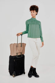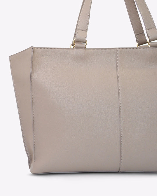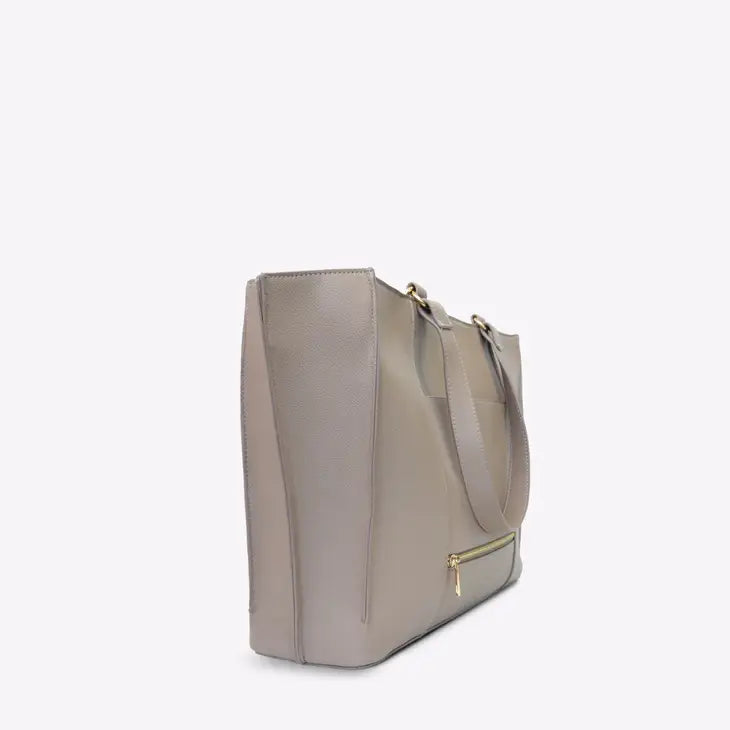 Introducing the Paloma Travel Tote in taupe and black, a spacious and sturdy companion for your essentials. Crafted from pebbled PU, it maintains its shape during travels. Unzip the top to reveal MERSI's signature lining, multiple pockets, a 16-inch laptop compartment, and a handy water bottle slot. Attach keys to the key fob and enjoy stress-free travel by slipping the bag onto a suitcase or converting the trolley slot into an extra pocket for added space!
