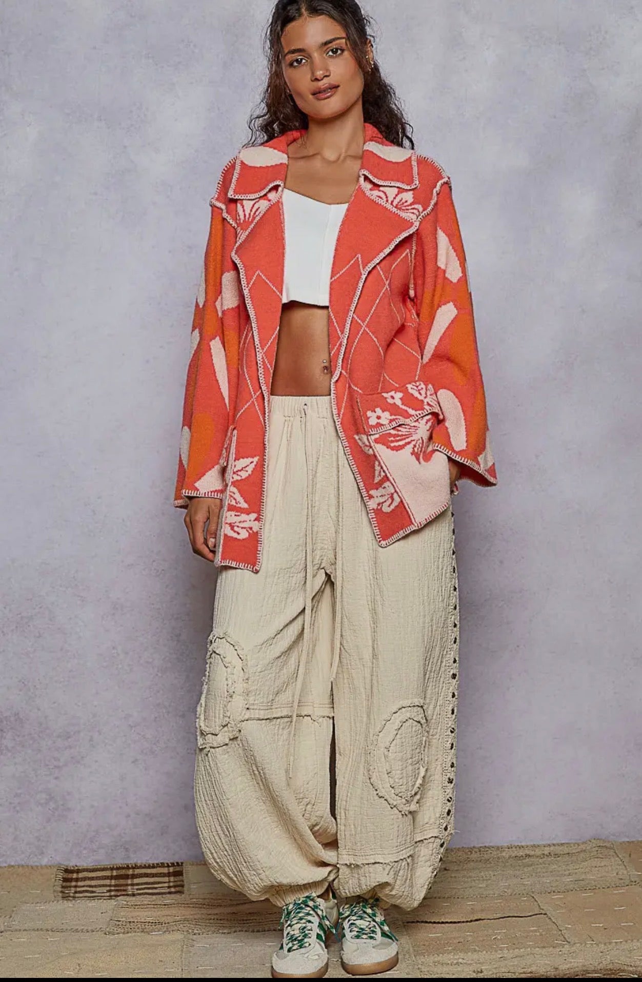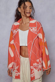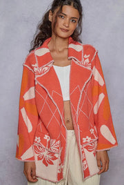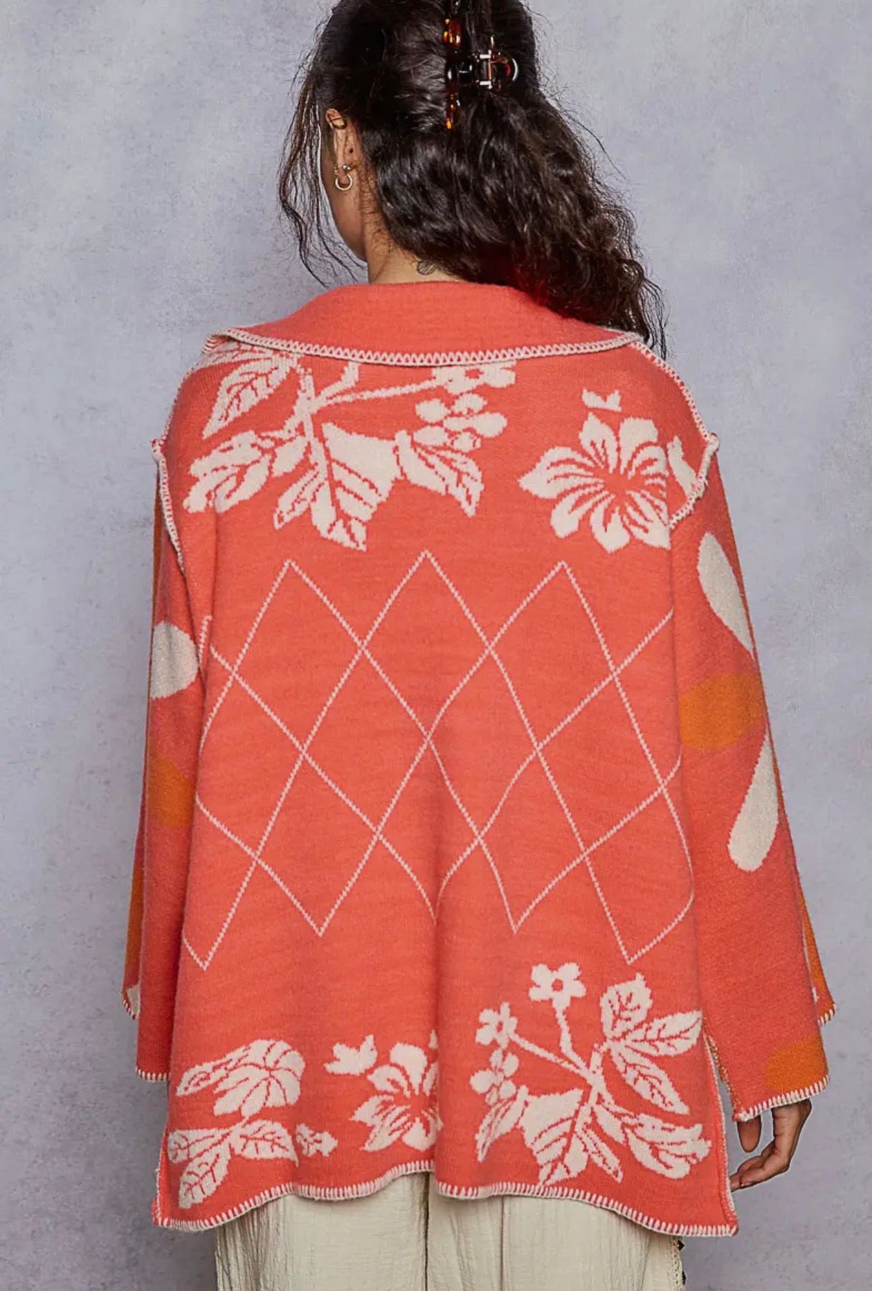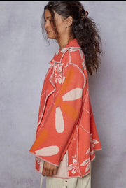 POL Coral Red Stitch Detail Floral Collared Relaxed Fit Cardigan