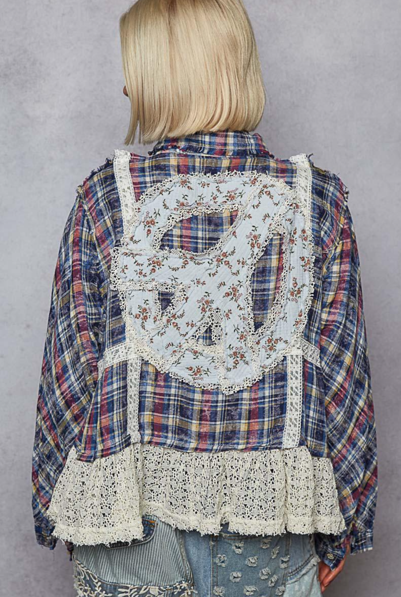 POL Plaid & Lace Full Zipper Peace Sign Plaid Shacket