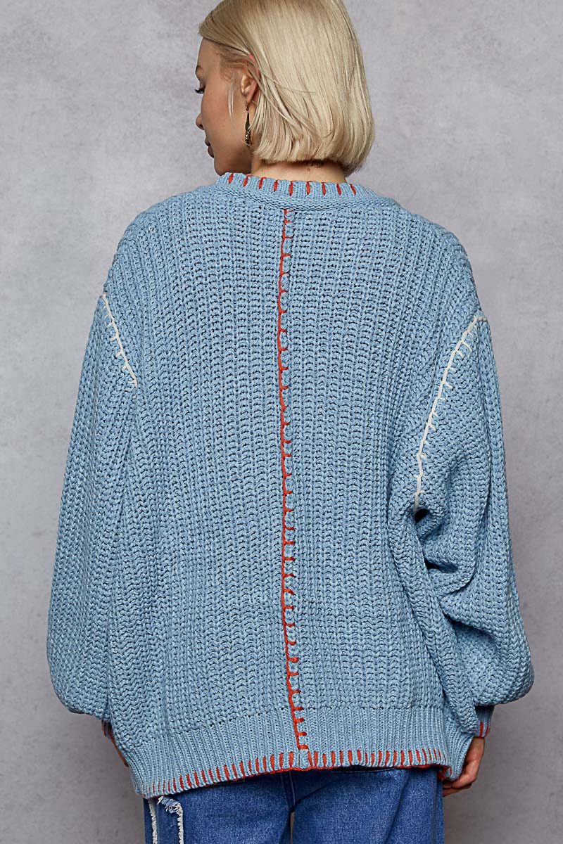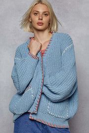 POL Solid Pattern Blanket Stitch Balloon Sleeve Open Cardigan