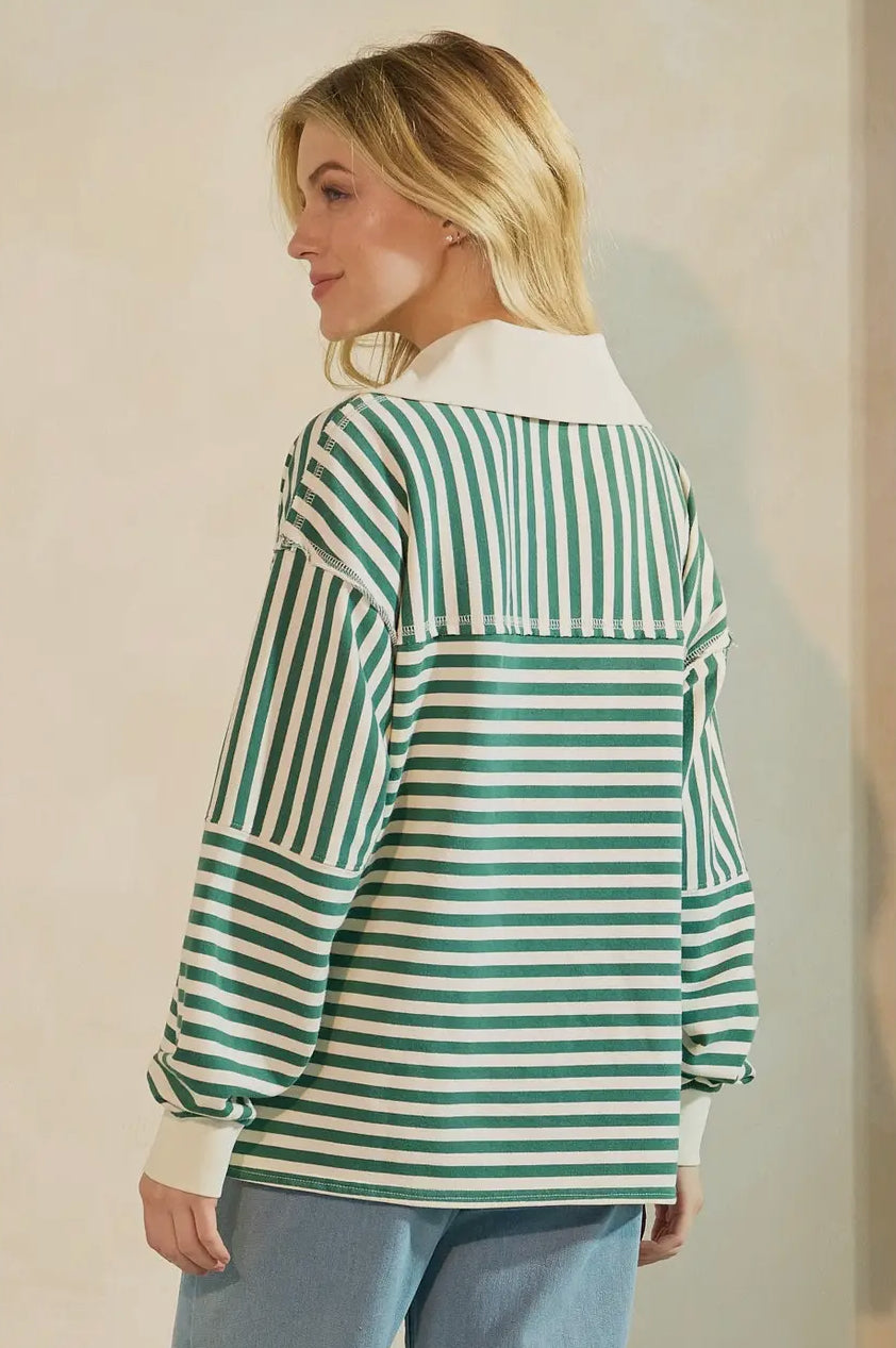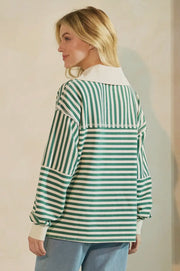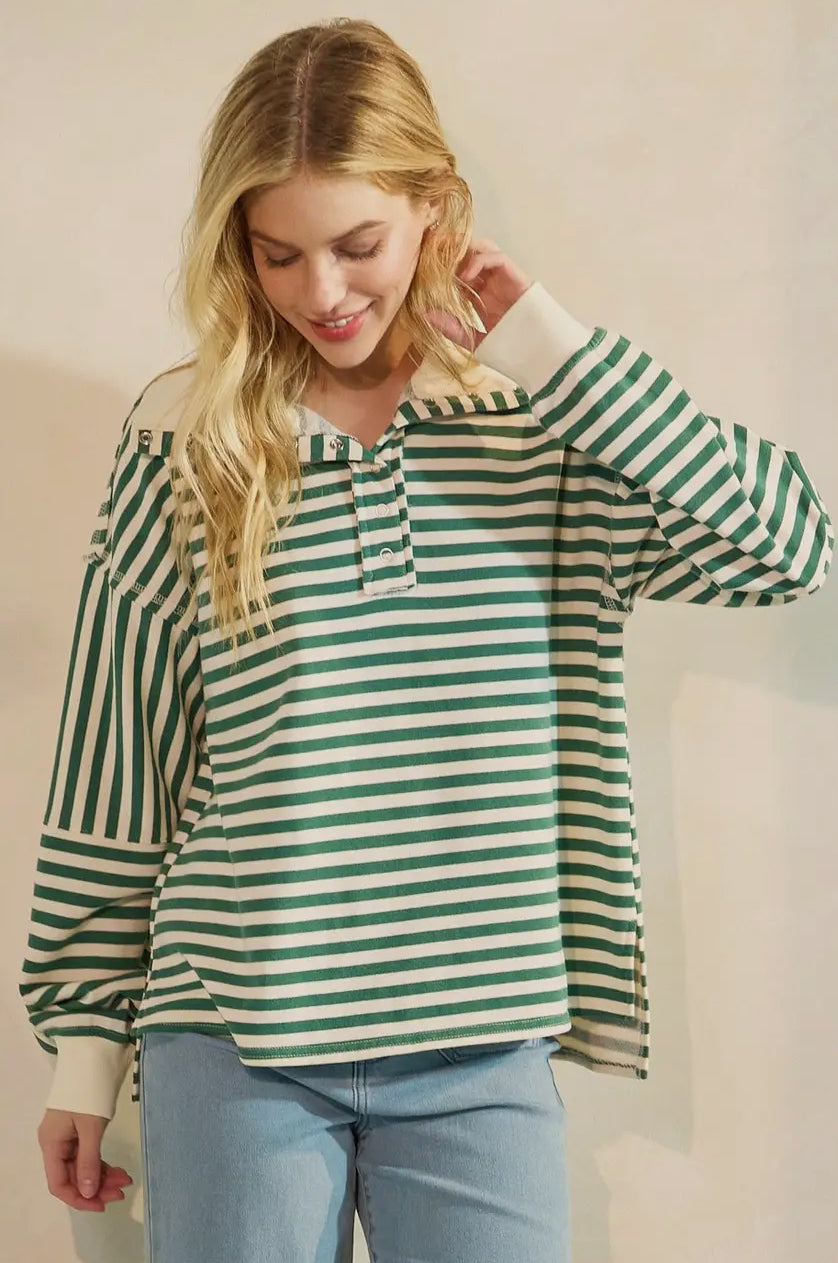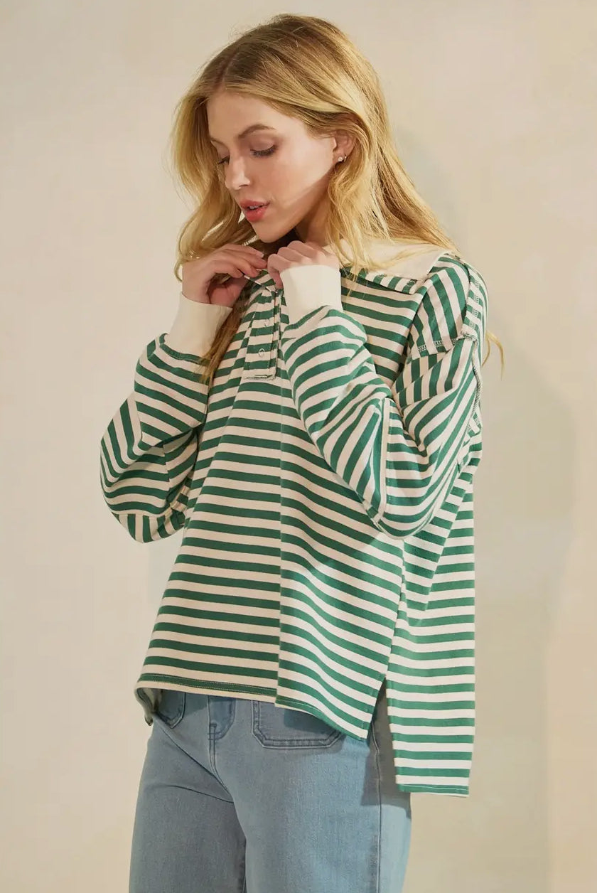 Striped Print Oversized Henley Collared Pullover